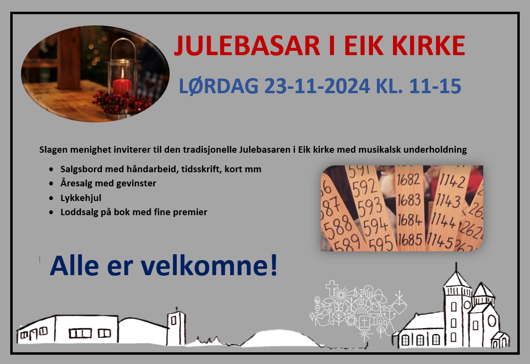 Slagen menighet inviterer til den tradisjonelle Julebasaren i Eik kirke med musikalsk underholdning